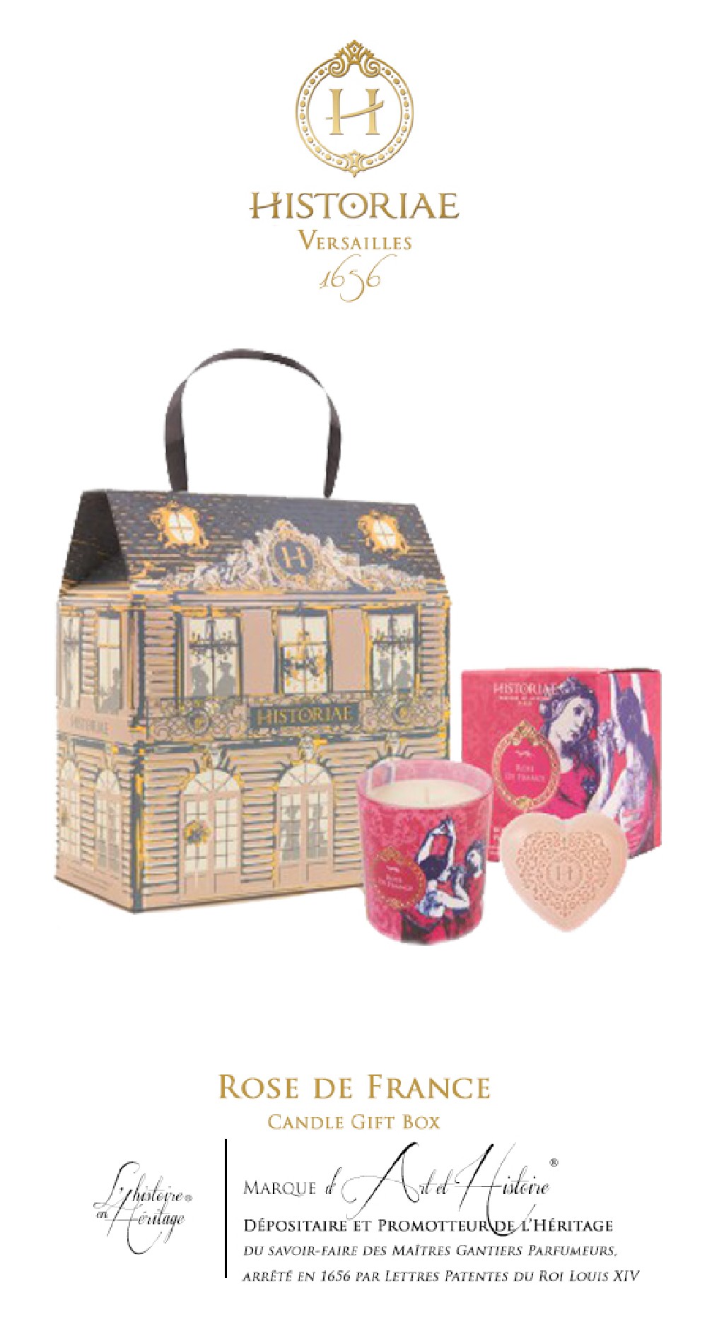 Rose de France plunges us into the refinement of the Renaissance with a subtle scent of Damascena Rose shrouded in a benzoin's balsamic fragrance brought back from the kingdom of Siam. Gift box Castle with handle (20x18x9cm) contains perfumed soap Rose de France 100g et Pop Art Candle Rose de France 190g.